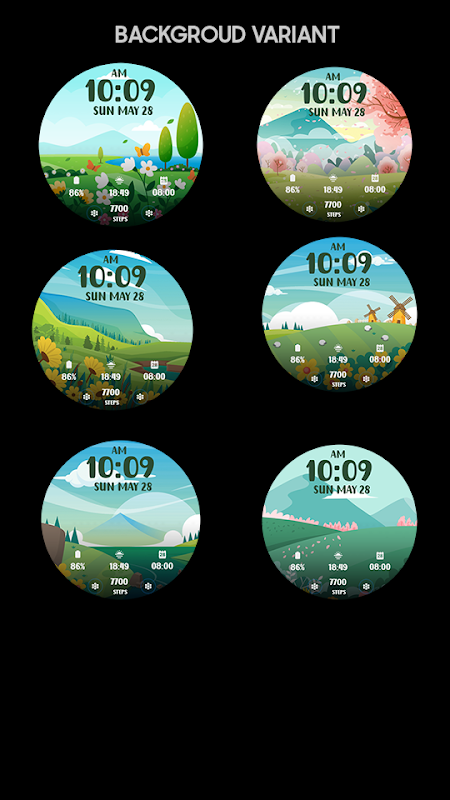 Esfera digital con ilustración de paisaje primaveral. Para reloj inteligente Wear OS. Característica :