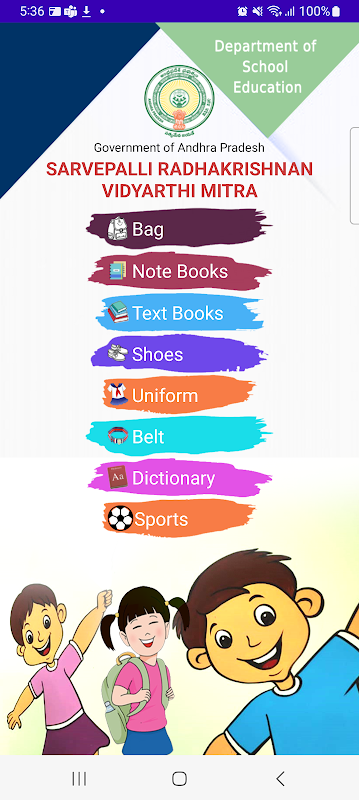 “Sarvepalli Radhakrishnan Vidyarthi Mitra” es un plan del Departamento de Educación Escolar del Gobierno. de Andhra Pradesh. El plan tiene como objetivo minimizar el abandono, mejorar la tasa bruta de matriculación, mejorar la participación de los estudiantes en las actividades de aprendizaje y, por lo tanto, mejorar los resultados del aprendizaje de los niños. Esta aplicación monitorea la distribución del kit proporcionado por el gobierno de AP para los estudiantes de las clases 1 a 10 de las escuelas públicas de AP. El kit incluye artículos como mochila escolar, libros de texto, cuadernos, uniformes, zapatos, cinturón, diccionario y otros artículos de papelería bajo este esquema.