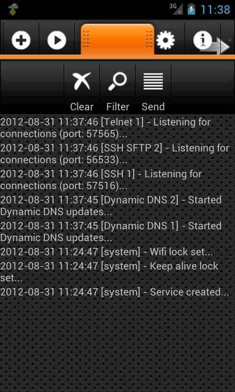 - For every SSH Server you can set name, port, multiple users, only access from certain IP addresses, vibrate on a new connection, enable logging, only log errors, start the server when connected to a specific WIFI network and disconnect when the WIFI network is lost, start on boot, max auth attempts, authorization timeout, idle timeout, max concurrent sessions (per user)