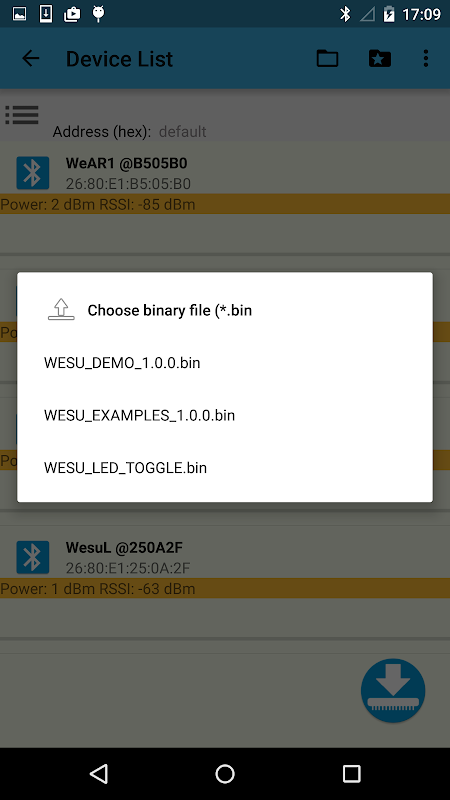 Cuando el nodo está en el modo DFU OTA, se reconoce por el nombre OTAWeSU. Si el nodo está conectado correctamente y el protocolo OTA está disponible, el de a bordo blanco LED parpadea más rápidamente para indicar que la aplicación está listo para actualizar el nodo con el archivo binario de firmware seleccionado.