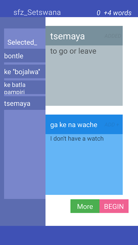 Partiendo de cero, 'recoger' hasta 9 palabras Setswana después de cada sesión y aprender a su propio ritmo. StartFromZero_Setswana aplicación es una aplicación tarjeta de memoria flash y concurso muy sencilla, intuitiva y eficaz que le ayuda a construir su vocabulario Setswana a partir de hoy!