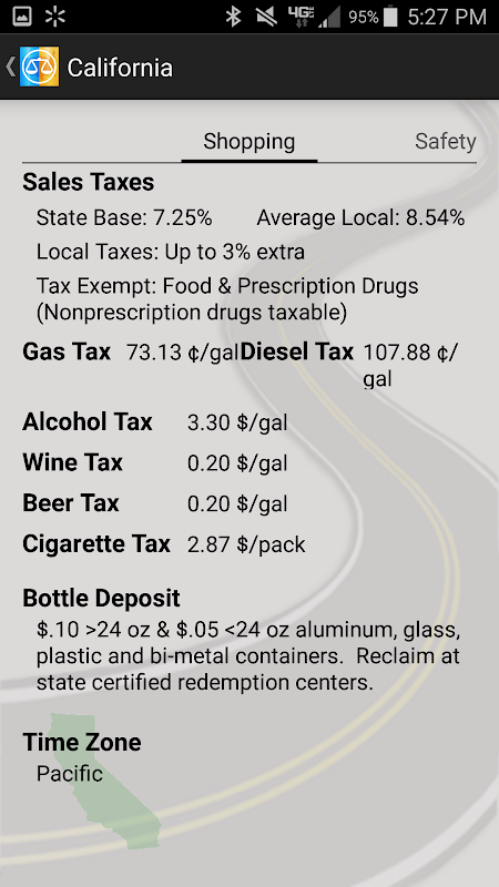 Actualmente Estado Líneas seguimiento de más de 55 piezas de viajes información relevante para cada uno de los 50 estados; incluyendo el teléfono celular y la prohibición de mensajes de texto, los asientos de los cinturones de seguridad y de seguridad para niños, exención de impuestos sobre las ventas, impuestos a la gasolina / diesel, depósitos de botellas, husos horarios, de remolque y RV leyes específicas, límites de estacionamiento durante la noche área de descanso, las entradas al parque para acampar estatales, velocidad predeterminada límites, detectores de radar, Nºs de carretera de emergencia, las leyes de venta de bebidas alcohólicas e impuestos, prohibiciones de fumar, las leyes de contenedores abiertos, leyes correa de mascota, las leyes del casco de la bicicleta, las leyes de la motocicleta (casco, luces, protección ocular y compartir el carril), que quedan vueltas en rojo, cambios de sentido, manténgase a la derecha y más.