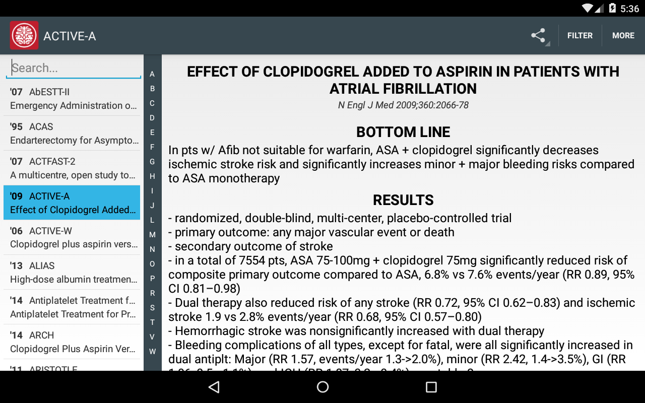 This app is a compilation of landmark articles in vascular neurology intended for quick reference. Clicking on a study, like WARSS, leads you to a brief outline of the bottom line, results, limitations, as well as a link to the original article. Articles are listed alphabetically and may be searched by tagged keywords using the filter option in the top right corner. Click on the “more” section for an anti-thrombotics reference. The app is updated periodically with additional trials.