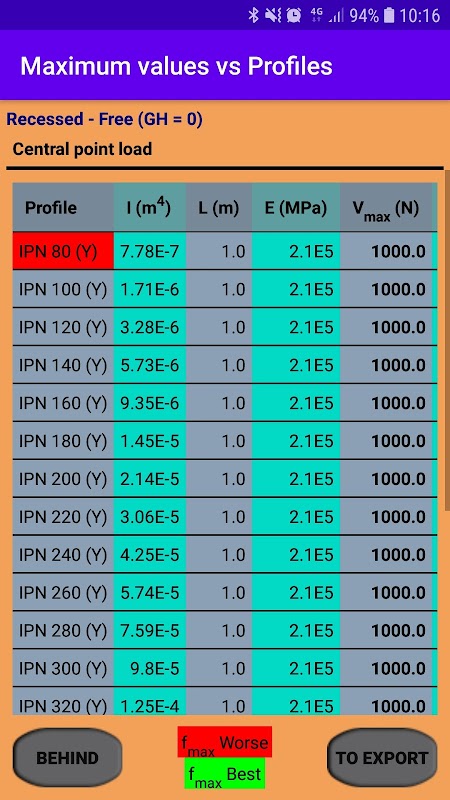 b) Tabla comparativa para diferentes perfiles de una familia con mismos apoyos y cargas.
