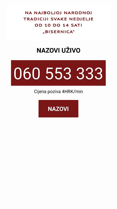 En la mejor tradición popular, todos los domingos de 10 a.m. a 2 p.m., BISERNICA encuentra su camino hacia sus oyentes a través de la tamburitza y la música de los KUD y los grupos de música locales, buscando así preservarlo del olvido y transmitirlo con el mismo fervor y amor para las nuevas generaciones.