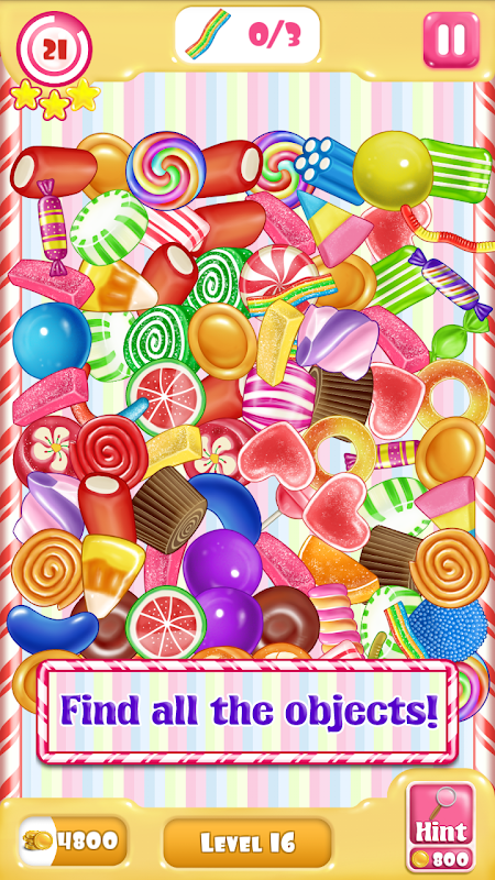 Fíjense bien, solamente un detective de un ojo exigente puede encontrar todos los objetos ocultos que están llenas en un sitio de caramelos. Trate de "investigar rompecabezas" al máximo, buscar el caramelo de azúcar, detectarlo! ¿Todavía no distraerse por todas las decoraciones de la tierra de dulces, pero ser rápido y preciso, resolver los misterios, partido de 3 objetos misteriosos, o más, en todos los niveles para completar la misión. Y, si usted está aburrido con juegos de objetos ocultos en línea gratis, descargar esta aplicación para Android™, que es uno de los más lindos "fuera de línea gratis juegos de objetos ocultos" y disfrutar de las aventuras!