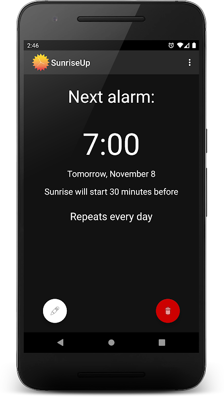 Do you have problems getting out of bed when it is still dark or when your curtains are still closed? Not anymore! SunriseUp Wake Up Light Alarm Clock will use your phone to simulate the sunrise before your alarm will ring. The light emitted from the screen will trigger your brain to wake up as naturally as with a real sunrise. The app has the same fluent flow as a real sunrise going from yellow to white, and by smoothly increasing the brightness of your screen. The flashlight of your device can be turned on upon the ringing alarm to create extra light. You can now wake up with a sunrise every morning, without having to purchase a wake up light.