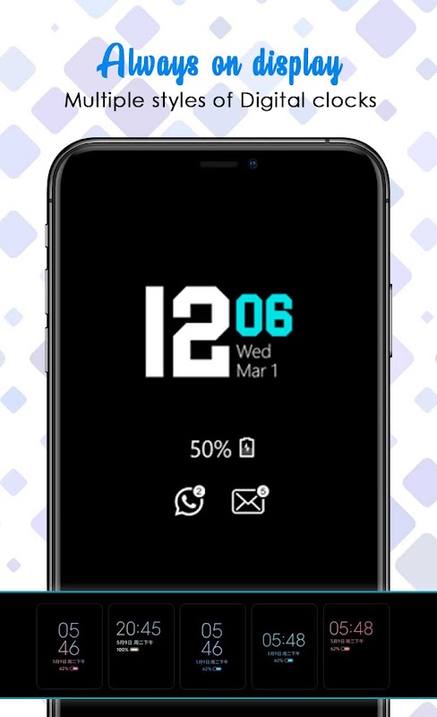 Además, tiene iluminación de borde para mantenerse alerta en un lugar oscuro, también la aplicación tiene siempre en pantalla fondos de pantalla que están diseñados para mantener la pantalla lo más tenue posible y aún mostrar hermosos diseños y patrones.