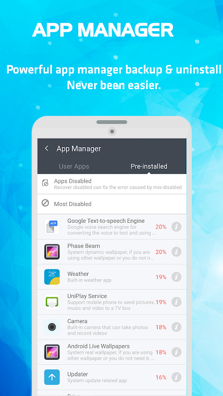 Le ayuda a administrar aplicaciones instaladas en su dispositivo. Especialmente con la capacidad de categorizar la aplicación nativa y las aplicaciones de usuario instaladas, así como dar consejos sobre la desinstalación y el cierre con la aplicación no suele utilizarse para aumentar la memoria del teléfono.