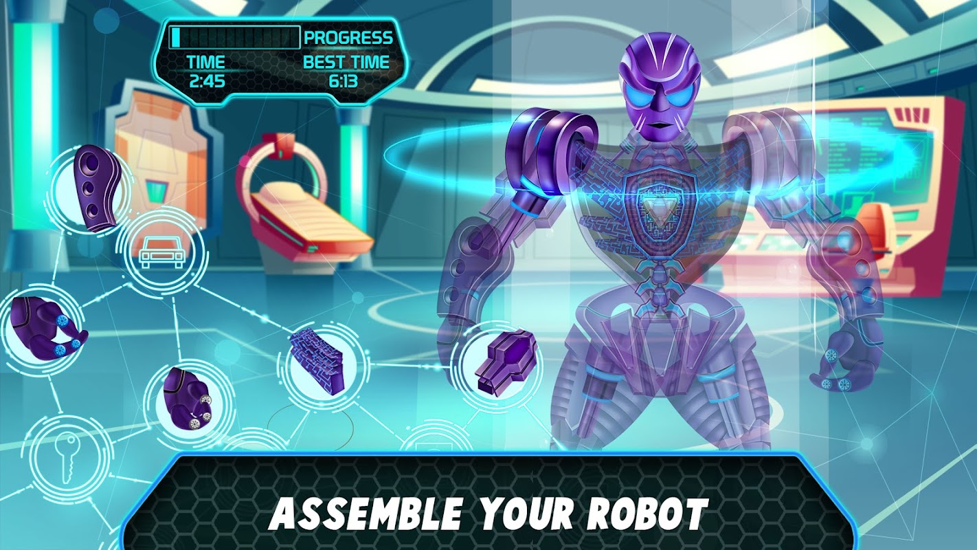 En el modo Robot Transform primero, tendrías que construir el cuerpo del robot superhéroe. Luego, en este juego de superhéroes de robots, tendrías que ensamblar las partes mecánicas del mono del robot de velocidad de flash. Contiene instrucciones del ensamblador de robots para armar el resistente disfraz de robot de superhéroe para la transformación. Habrá un reloj en la parte superior izquierda de la pantalla. Se notará lo rápido que ensamblas las partes del cuerpo del traje de juguete, las partes del robot dron transformador para obtener velocidad y súper fuerza. Superhéroe Robot simulación juego de correr y volar para niños.
