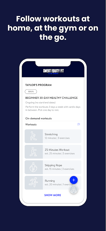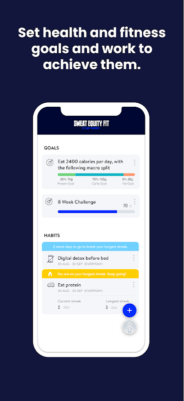 ¡Con la aplicación Sweat Equity Fit, tendrás acceso a programas de entrenamiento diseñados específicamente para ayudarte a alcanzar tus objetivos de salud y fitness! Puedes seguir y realizar un seguimiento de tus entrenamientos, tu nutrición, tus hábitos de estilo de vida, mediciones y resultados, todo con la ayuda de tu entrenador.