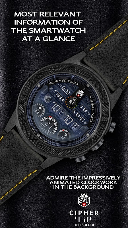 La serie SWF Cipher Chrono PRO impresiona con un mecanismo de relojería animado detallado en el fondo y le permite crear miles de combinaciones diferentes al combinar libremente el borde, el bisel, el vidrio, los números, las manecillas, los colores y más. La serie PRO le permite configurar hasta 2 complicaciones y 6 aplicaciones personalizadas en la esfera de su reloj.