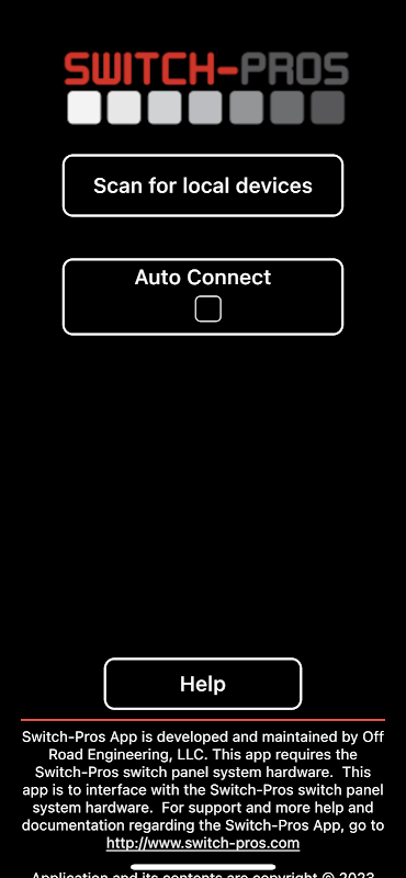 Esta aplicación interactúa con los sistemas de alimentación del panel de interruptores de la marca Switch-Pros. Permite a los usuarios programar y operar su sistema de panel de interruptores usando un dispositivo conectado por Bluetooth. Off Road Engineering LLC brindará soporte para esta aplicación, con la asistencia del desarrollador de la aplicación, cuando sea necesario.