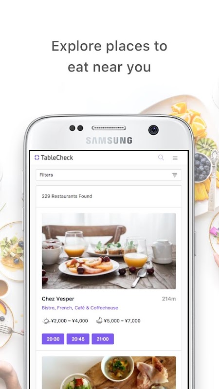Busque restaurantes en varios idiomas, vea instantáneamente los horarios de asientos disponibles y toque para ir a la página de reservas.