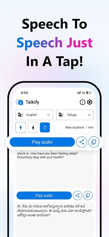 Experience the power of Talkify, your all-in-one app for transforming text into lifelike audio, seamless language translations, and even speech-to-speech capabilities. Whether you're enhancing accessibility, learning languages, or creating compelling content, Talkify offers unmatched versatility and user-friendly operation.