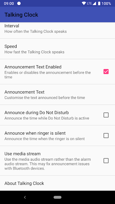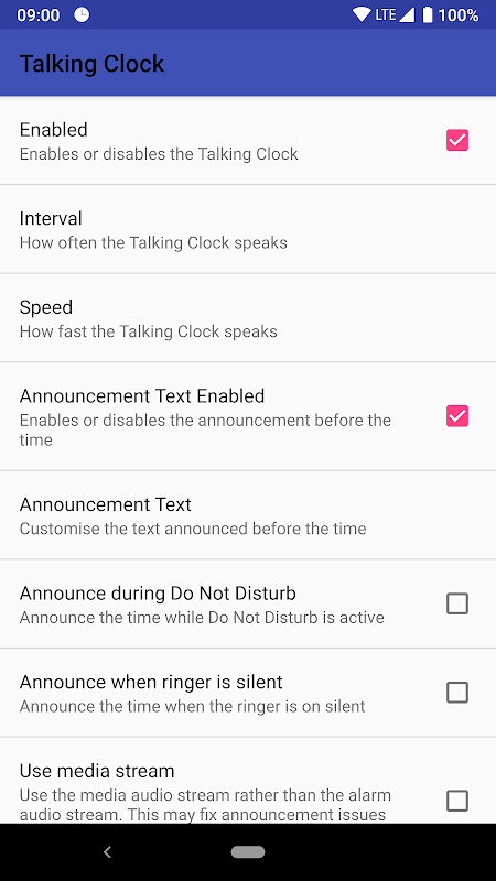 - Respeta otras aplicaciones de audio permitiéndoles hacer una pausa durante el anuncio de tiempo y luego reanudarlas inmediatamente después.