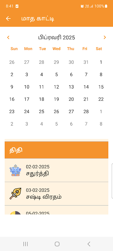 * Vista de mes: manténgase actualizado con importantes festivales tamiles, fechas de Thithi, Subha Muhurtham y Karinaal y otros días importantes para el mes seleccionado.