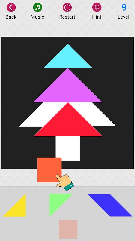 Tangram es un juego de rompecabezas de bloques y formas de polígonos en el que puedes crear formas poligonales de colores resolviendo los rompecabezas de Tangram. Deslice y conecte las formas de polígono en el tablero sin superponerlas y cree formas poligonales de colores.