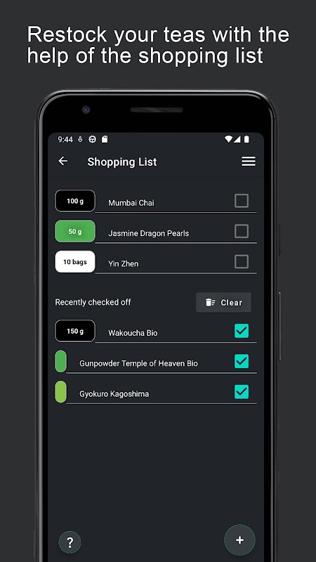 ¿Necesitas reponer tus tés, pero has perdido la cuenta de cuáles? Hay una lista de compras donde puedes agregar tés fácilmente.