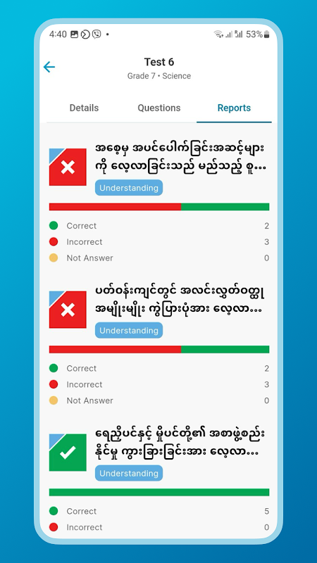 La aplicación presenta un sistema de boleta de calificaciones donde los estudiantes pueden comparar sus puntajes individuales con el promedio de la clase. Esta característica promueve la responsabilidad entre los estudiantes y los motiva a participar activamente en su viaje de aprendizaje.