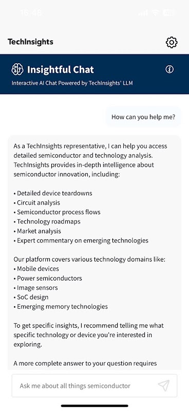 Descubra una nueva ventaja competitiva: Insightful Chat, con tecnología de IA, en la aplicación móvil de TechInsights, facilita el acceso a información exhaustiva sobre semiconductores con solo hacer una pregunta.