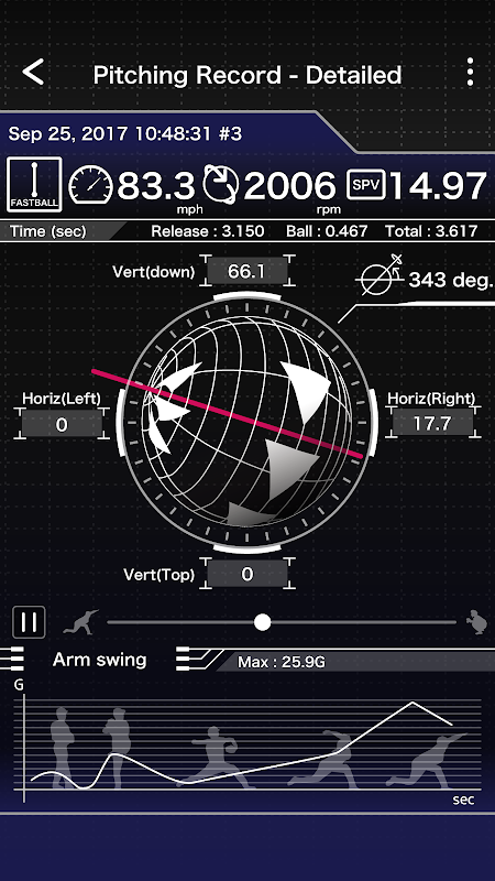 TechnicalPitch analiza el tipo de bola, la velocidad de la bola, la revolución, el eje de rotación y el desplazamiento.