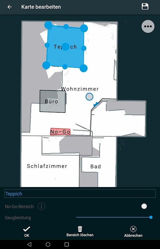 Además de todo el apartamento, también se pueden limpiar habitaciones y áreas individuales. Además, estos pueden nombrarse personalmente y la potencia de succión se puede configurar individualmente para cada habitación / área.