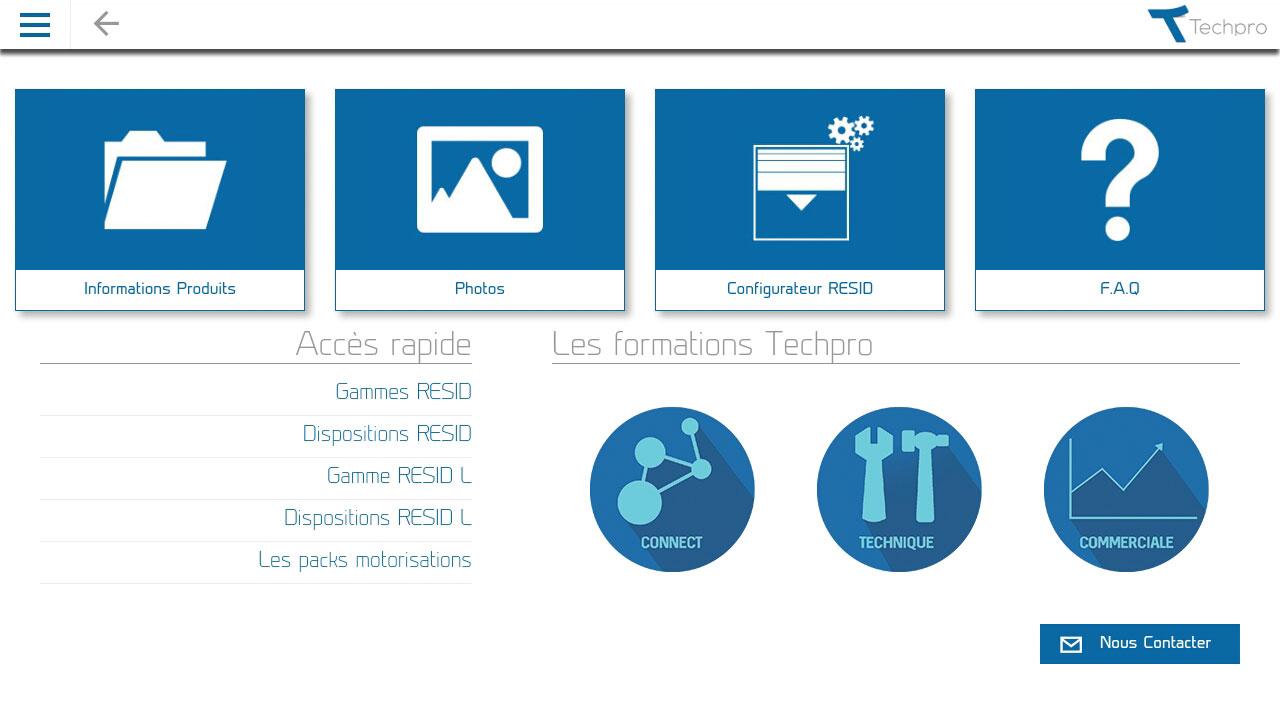 L'application Techpro permet à nos clients professionnels, d'accéder à l'ensemble de nos outils et documents techniques : Fiche Produit, Configurateur, Galerie photo, FAQ, ...