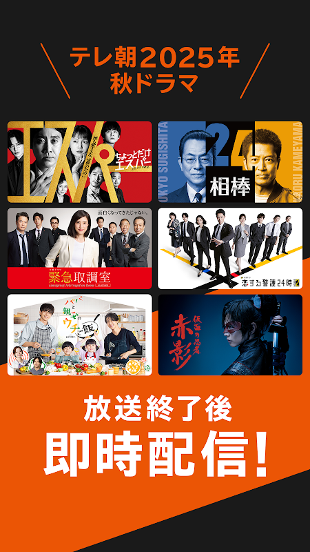 Además de los populares programas de TV Asahi, ofrecemos una amplia selección de dramas, programas de variedades, anime, películas y efectos especiales, así como dramas y programas musicales exclusivos de TELASA, además de dramas extranjeros, dramas coreanos y programas musicales, y dramas y programas de variedades tailandeses.