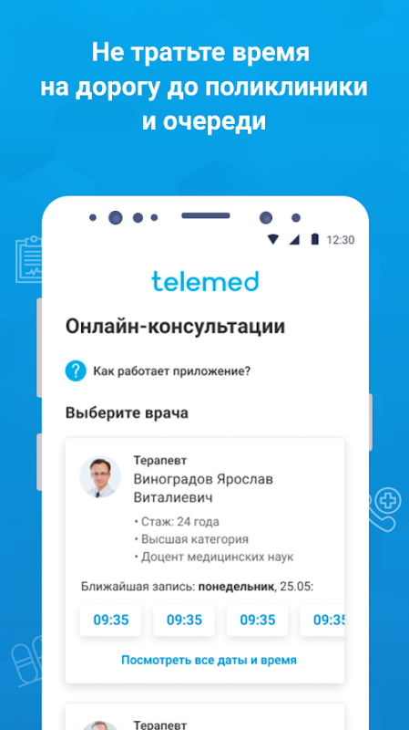 Telemed - сервис, с помощью которого вы можете проконсультироваться с врачом онлайн в любое удобное для вас время в комфортном для вас месте. Нет необходимости тратить время на дорогу и очереди. Онлайн-консультации проходят в виде аудио- или видео-звонка, также вы можете пообщаться с врачом в чате. После каждой консультации врач выписывает заключение и рекомендации. В приложении Вы можете просмотреть истории консультаций