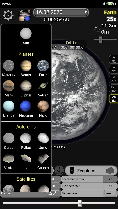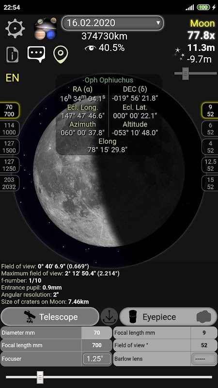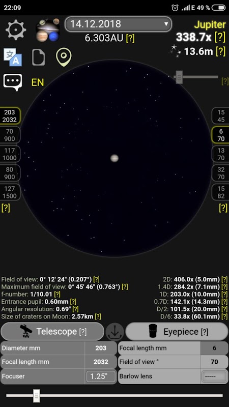 Cálculo de parámetros y características de telescopios utilizando diferentes oculares y visualización.