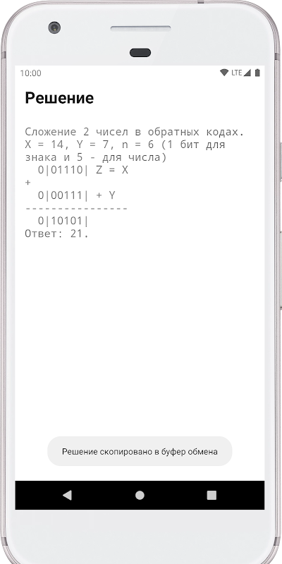 Позволяет складывать, вычитать и умножать числа в обратном и дополнительном кодах, используя модифицированный код (при умножении). Числа переводятся в двоичные, приложение осуществляет выбранную операцию и показывает решение, которым можно поделиться с друзьями.