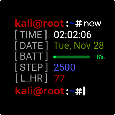 Más que una carátula de reloj, es una declaración de identidad geek. "Terminal KaliLinux Watch Face" transforma tu smartwatch en un homenaje visual al mundo del software libre, la programación y la seguridad informática.