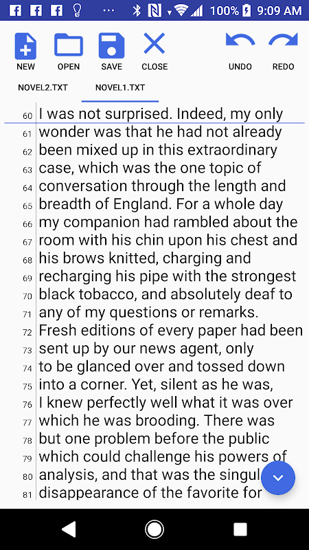 Material design text editor. By pressing the new creation button, you can add tabs of untitled text. By pressing the open button, you can open the file dialog, select text file and open it. In the file dialog, when you press home, you go to the original position, and press up to refer to parent. By pressing the save button, you can overwrite it or save it with a name. By pressing the close button you can close the active tab. You can restore the text by undoing or redoing. When opening, the displayed file is a folder and Android's MIME standard text file. If the file size is too large, OutOfMemory will display an error message. The text file memorizes the scroll position when closing it, the scroll position is restored when the text file is reopened. Convenient specification for reading long sentences. The line number indication is a text wrapping unit. Very simple and easy to use specification.