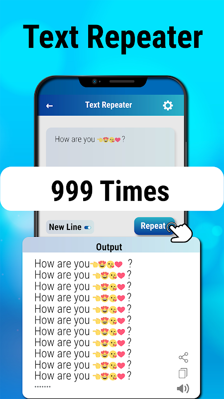 La aplicación Text Repeater es una solución innovadora para mensajes repetitivos. Repite tu texto tantas veces como quieras con el repetidor de texto. Repita un mensaje o una frase varias veces, copie fácilmente su texto repetido en el portapapeles y compártalo directamente con sus contactos a través de aplicaciones de mensajería o plataformas de redes sociales con la aplicación Text Repeater. Haga letras repetidas usando el alfabeto y los caracteres emoji, y observe cómo sus mensajes cobran vida con Text Repeater uno por uno.