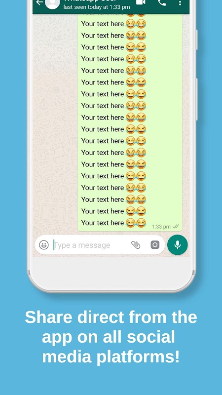 Text Repeater es la aplicación de repetición de texto definitiva para WhatsApp y otras plataformas de mensajería, diseñada para repetir texto y emojis sin esfuerzo. Ya sea que esté buscando un repetidor de mensajes por diversión o necesite un bombardero de texto para uso práctico, esta aplicación lo tiene cubierto. Con Text Repeater, puedes repetir fácilmente texto o emojis hasta 10.000 veces con solo un clic.
