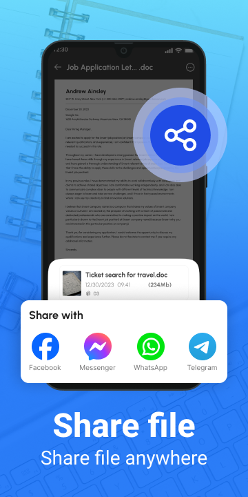 📱 ¡La aplicación permite leer y compartir sin problemas todo tipo de documentos: DOCX, PDF, Excel, PPT, TXT, etc.! Escáner de texto OCR: escanee, convierta y comparta fácilmente.