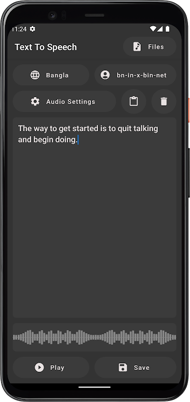 Texto a voz: Convertir y guardar es su aplicación de texto a voz (TTS) definitiva para convertir palabras escritas en un discurso claro y con un sonido natural. Genere audio instantáneamente a partir de cualquier texto en varios idiomas y acentos, luego guárdelo y compártalo como un archivo MP3 o WAV. Ya sea que sea un creador de contenido, un educador, un estudiante de idiomas o simplemente necesite audio de un texto, esta aplicación lo tiene cubierto.