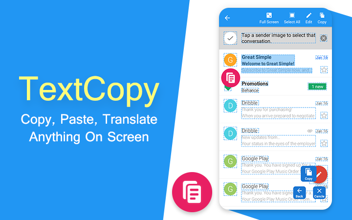 A veces, la pulsación larga predeterminada de Android no se puede usar para copiar texto de la aplicación, esa vez, la aplicación TextCopy es muy útil para copiar texto de la imagen, copiar texto de la cámara, copiar texto del navegador, copiar texto del libro, copiar el diccionario de texto, copiar texto de Instagram, copia de texto de facebook, copia de texto de linkedin, copia de texto de imagen fácilmente.