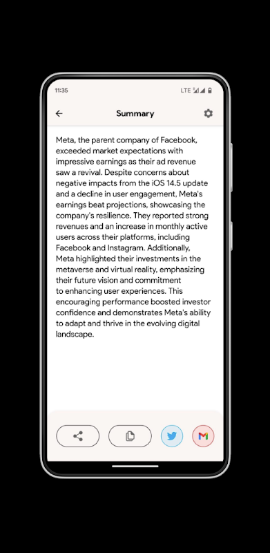 Resumir: esta función es útil para resumir textos extensos o enlaces a artículos. TextCraft puede generar un resumen conciso y fácil de entender. Al presionar prolongadamente en resumir, se mostrarán más opciones. Además, al habilitar la opción "Auto-Resumir enlaces" en la configuración, puede resumir los enlaces de artículos compartidos al instante.