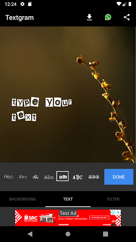 In the menu FILTER Textgram - Text on Photos, you can filter your text that you created with beautiful filter. Very easy to use, only click on the filter that you want and you can see the applied filter instantly.