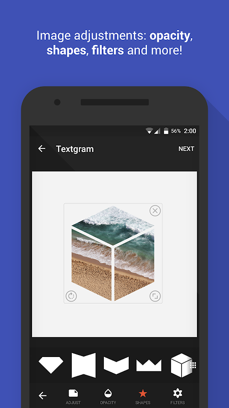 It also allows you to write on top of your photos and add stickers, frames, filters and other stuff. Textgram Store contains lots of free backgrounds, frames and fonts that you can download and use.