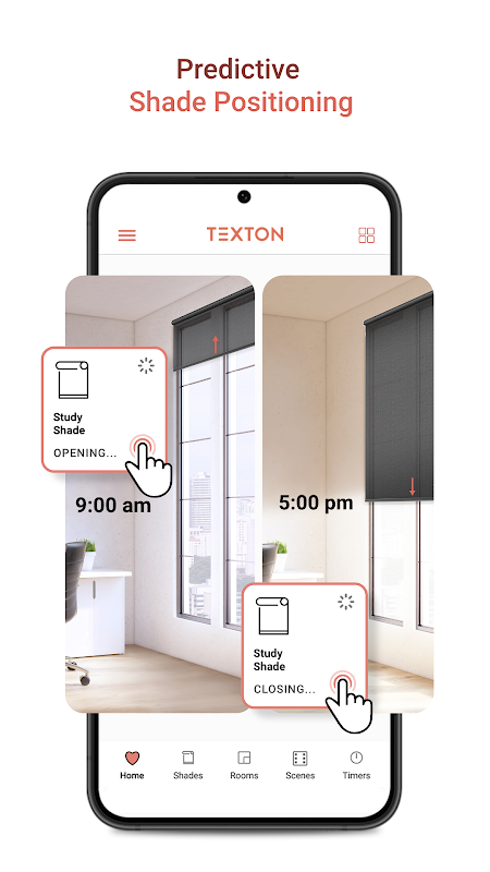 La nueva aplicación Texton no solo le permite activar, ajustar y colocar automáticamente sus persianas, sino que lo hace a través de One Tap on Shade Tiles. Un toque para cerrar, un toque para abrir y un toque para activar y detener escenas. Un doble toque detiene el funcionamiento de una persiana y una sola pulsación prolongada abre una pantalla de control de persiana dedicada que le da acceso a configuraciones más personalizadas.