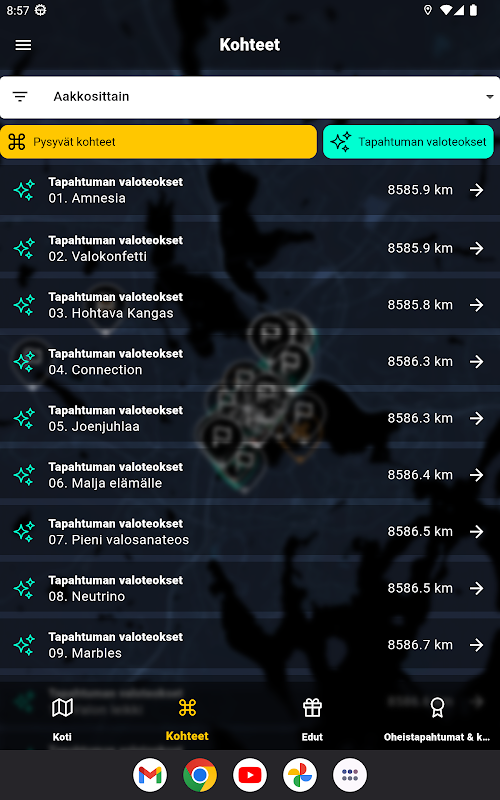 La aplicación presenta los destinos de iluminación en la ciudad de Valo y los beneficios de los socios.