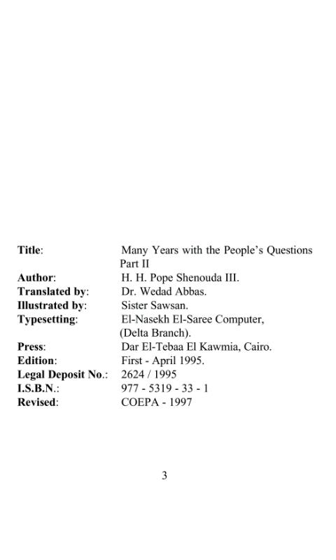 This Second Part includes theological and dogmatic questions that occupy the minds of the people. We tried to tackle them in an easy way as far as possible so that everyone may understand them. However, we still have enough theological and biblical questions for many books.