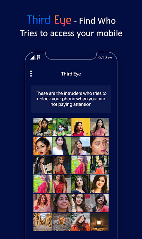 Tercer ojo, ojo oculto una vez que instale esta aplicación, capturará una foto del intruso que intenta desbloquear su dispositivo. Intruder Selfie Detector atrapa a todos los intrusos fácilmente: atrapa a una persona cuando ingresa un PIN, patrón o contraseña incorrectos. El detector de autofotos de intrusos es la mejor aplicación de Android que toma instantáneas o imágenes de su amigo que intenta desbloquear su teléfono móvil sin su permiso.