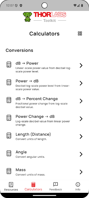 La versión actual de la aplicación incluye una colección de calculadoras que los ingenieros y técnicos de Thorlabs Lens Systems y otros lugares han utilizado en el piso durante más de 15 años. Cada página de la calculadora incluye las ecuaciones utilizadas en los cálculos, así como notas de uso e información sobre los supuestos incluidos en las ecuaciones.