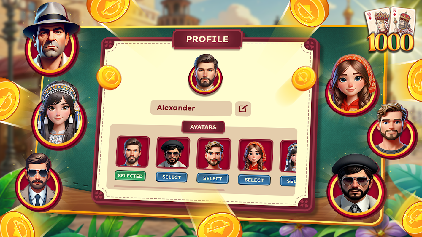 **Objetivo**: Ser el primero en alcanzar los 1000 puntos mediante pujas, bazas y matrimonios.