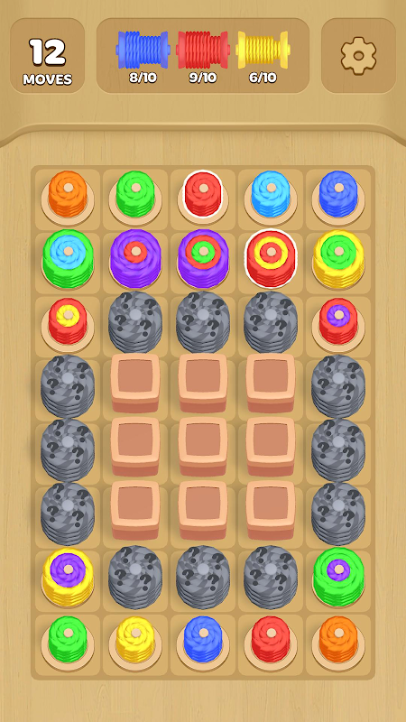 - Carrete de 3 colores: Un carrete, tres capas de color: ¡planifica con cuidado! - Carrete Negro: Fusiona carretes adyacentes para desbloquearlo.