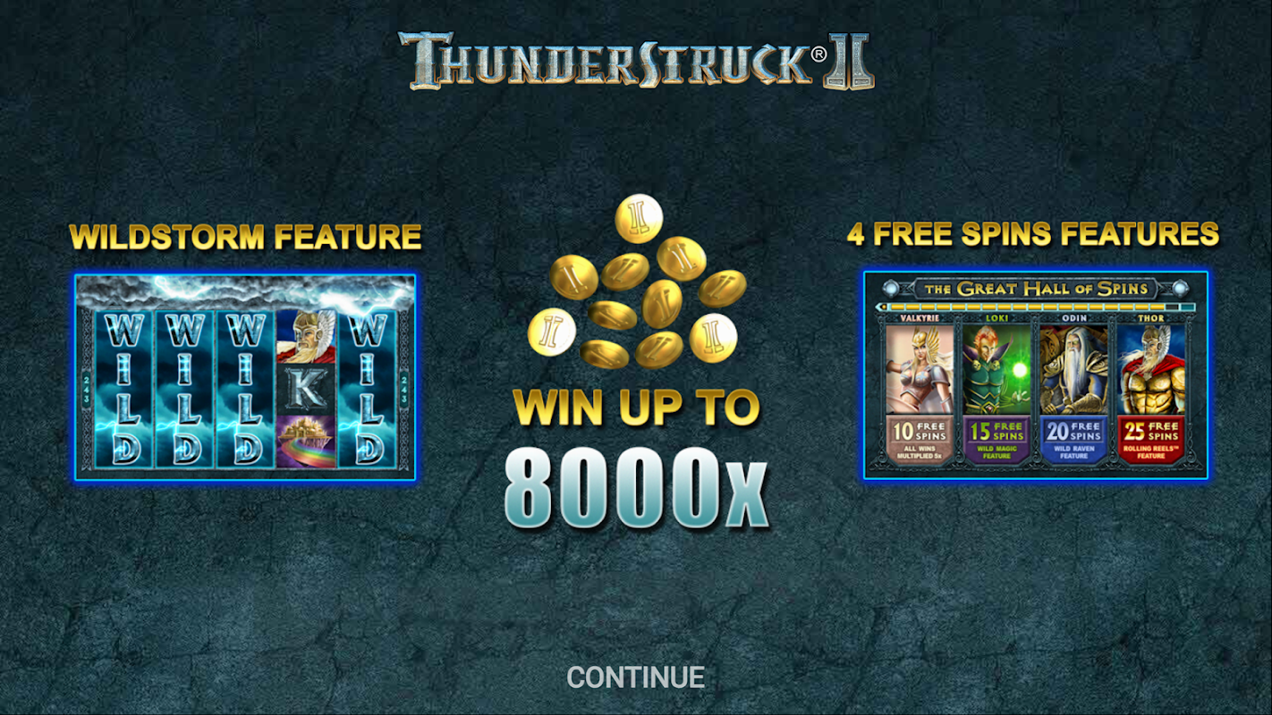 Ascend to the realm of Asgard in search of the mythical top prize worth more than 121,000 coins in 243-way video slot, Thunderstruck II. Wilds, random wilds and a selection of bonus modes await. Play for free with bets ranging from 0.30 to 15 coins per spin. Thunderstruck II offers maximum win on a single bet over 121,000 coins, 5 reels and 243 bet ways. If you’re a fan of innovative bonus modes, you’ll love Thunderstruck II and its multiple bonus rounds. Match three or more hammer scatters, and you’ll be given a choice of up to four bonus modes, depending on how many times you’ve accomplished this. Each bonus mode has its own unique features and number of free spins. Wilds can substitute for any regular symbol, and random wilds also occur. Match three or more Wilds to win up to 50 coins, or three or more Thors to win up to 25 coins.